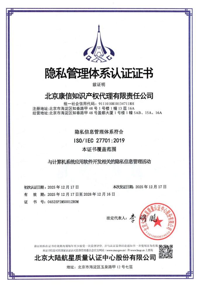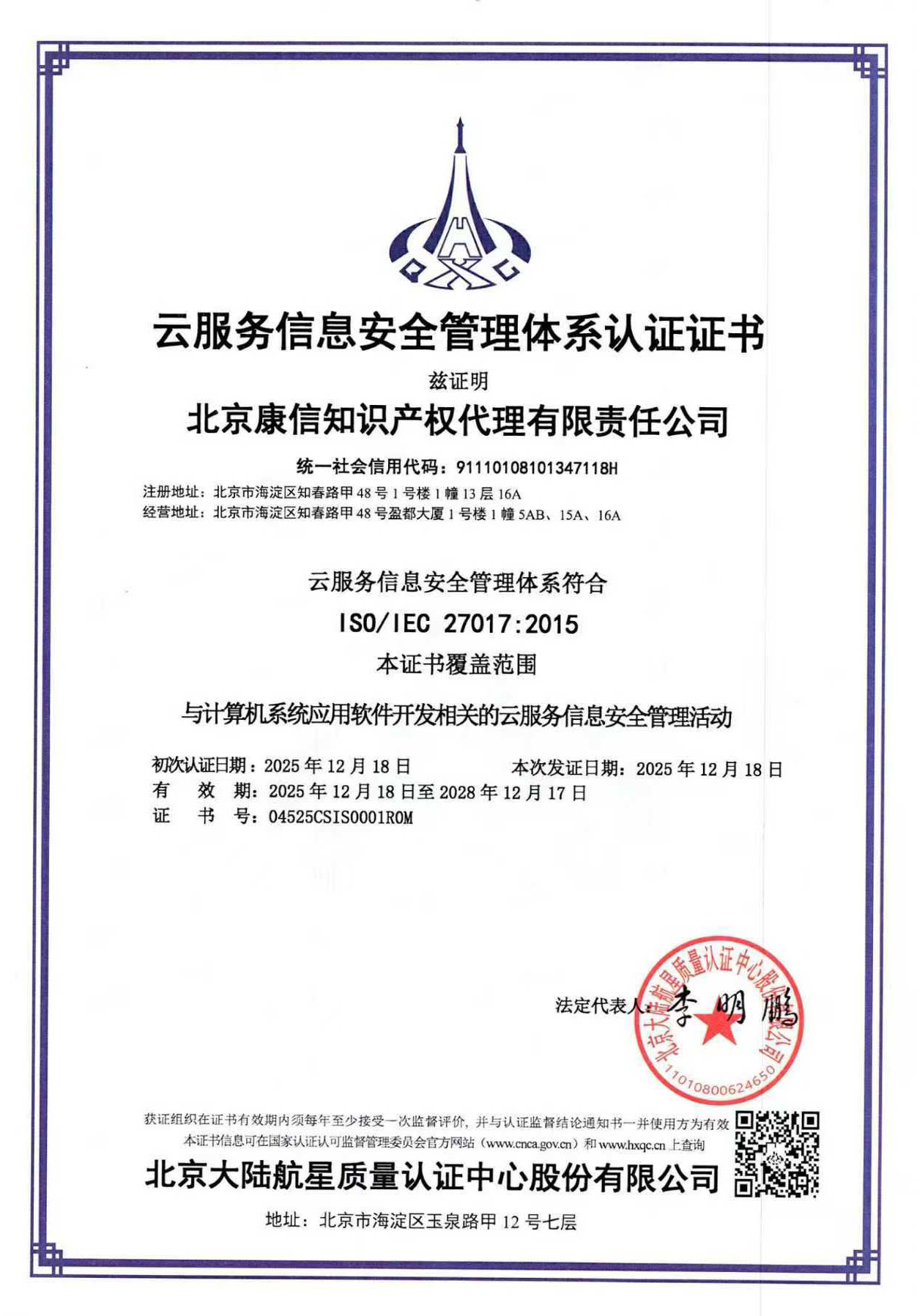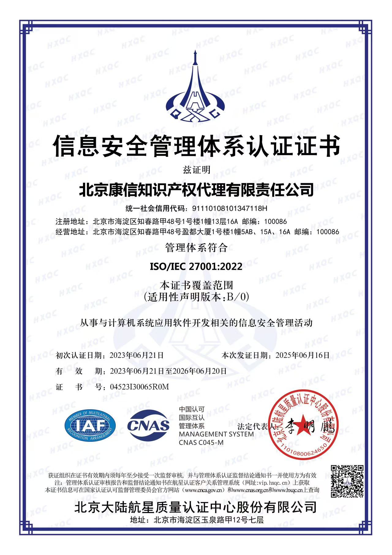 价值:全球公认的信息安全权威标准,证明康信已建立严丝合缝的数据资产防护流程。
